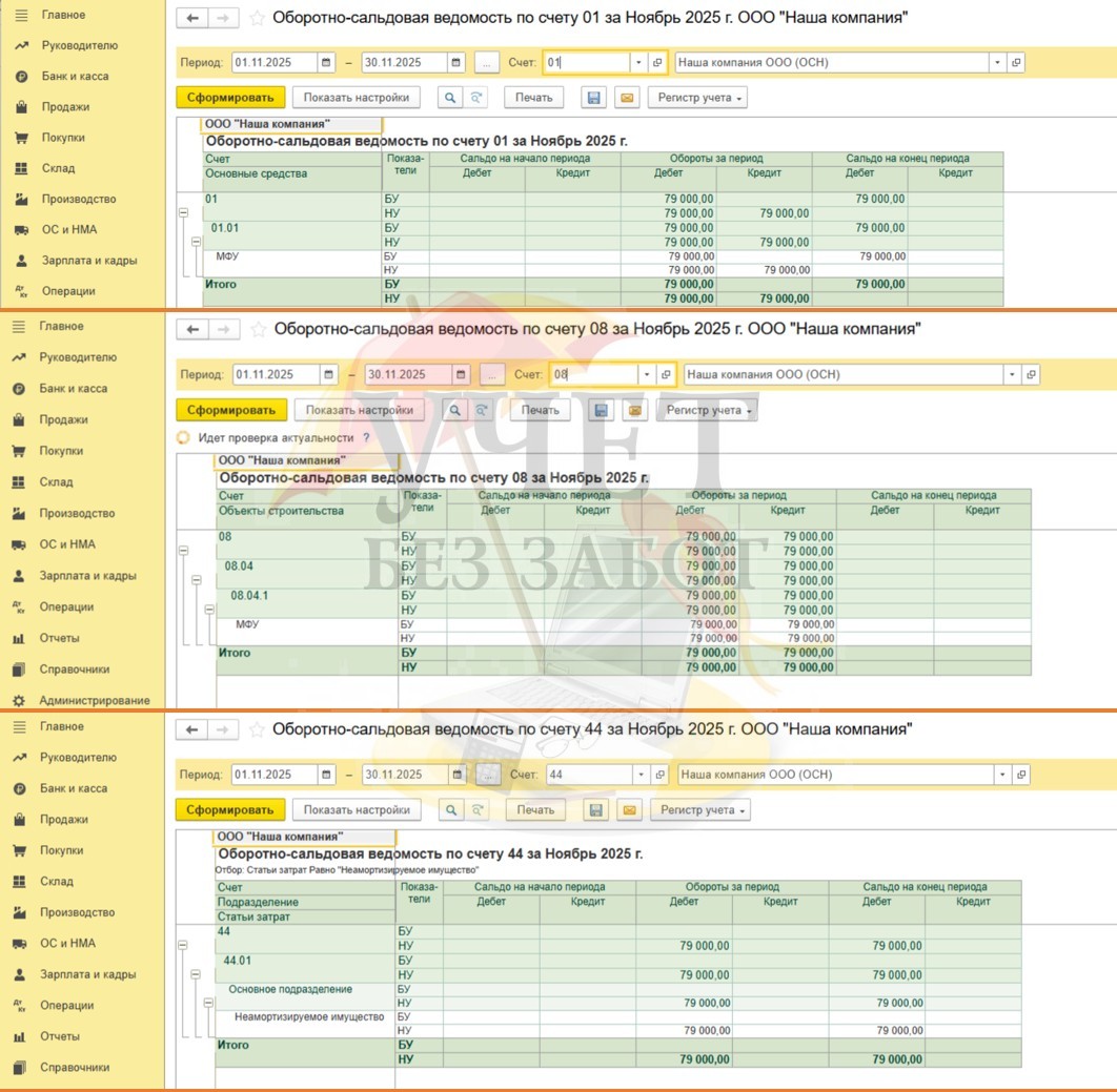 Счет 01 имеет остаток только по БУ – первоначальная стоимость основного средства;