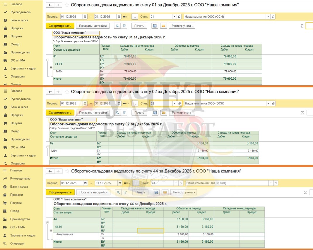 Отражение амортизации в учете: Д 44.01 К 02.01 Начислена амортизация в БУ.