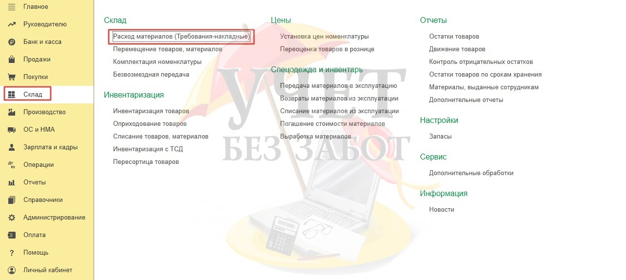 К запасам у вас будут относиться канцтовары (бумага, ручки, карандаши, степлеры, скрепки и т.д.). Их приходуете на субсчета 10 счета и списываете документом «Расход материалов (Требование-накладная)». На забалансовые счета такие материалы относить не нужно! Они к вам поступили, израсходовались в ближайшие месяцы, и вы их благополучно списали.
