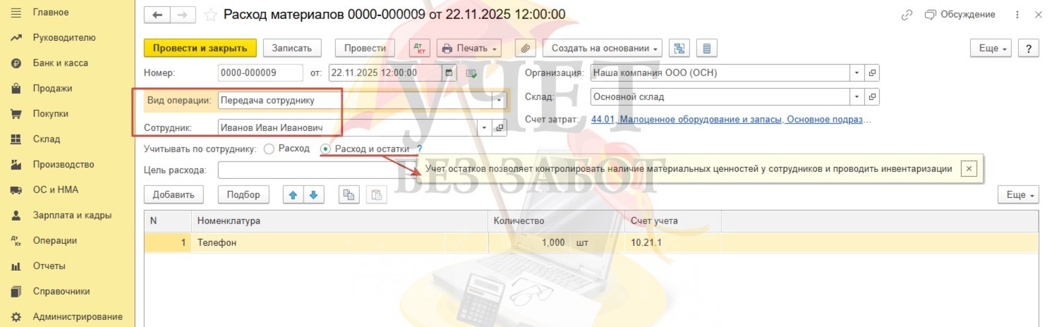 Вид операции выбираем «Передача сотруднику», в строке «Учитывать по сотруднику» выбираем пункт «Расход и остатки» для того, чтобы телефон был закреплен за работником и отражен на забалансовых счетах.