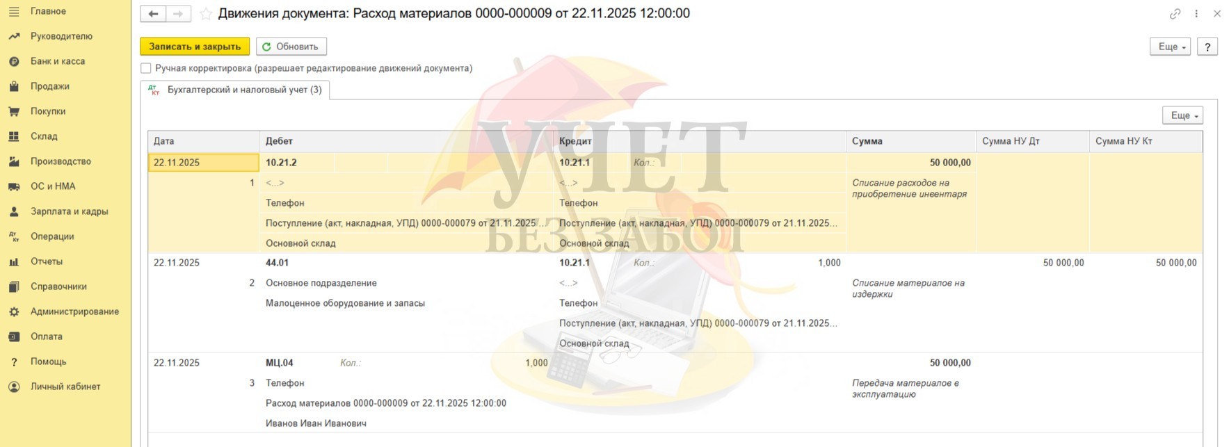 Д МЦ.04 Автоматически на забалансовом счете отражен телефон, стоимость и количество.