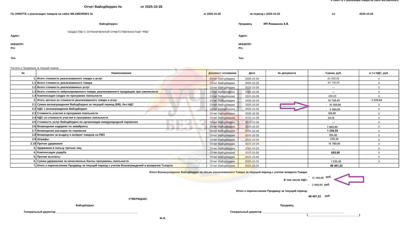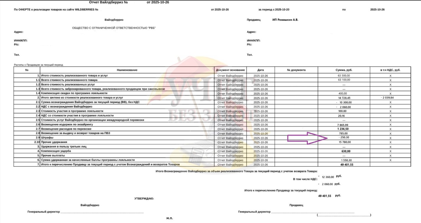 WB предоставляет нам отчет и доплачивает сумму «отрицательной услуги», поэтому считаем, что данная сумма является нашим доходом. Вспомним также, что возмещение расходов за выдачу товаров на ПВЗ и штрафы не облагаются НДС.