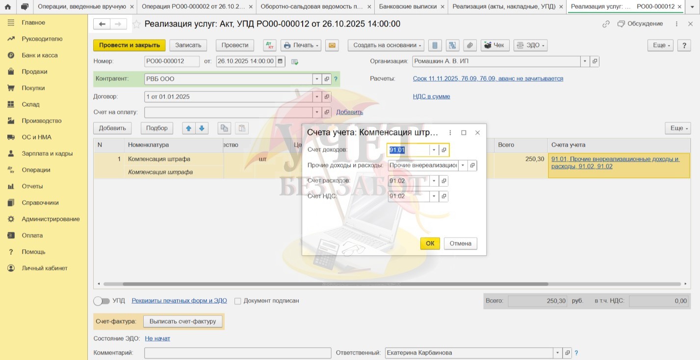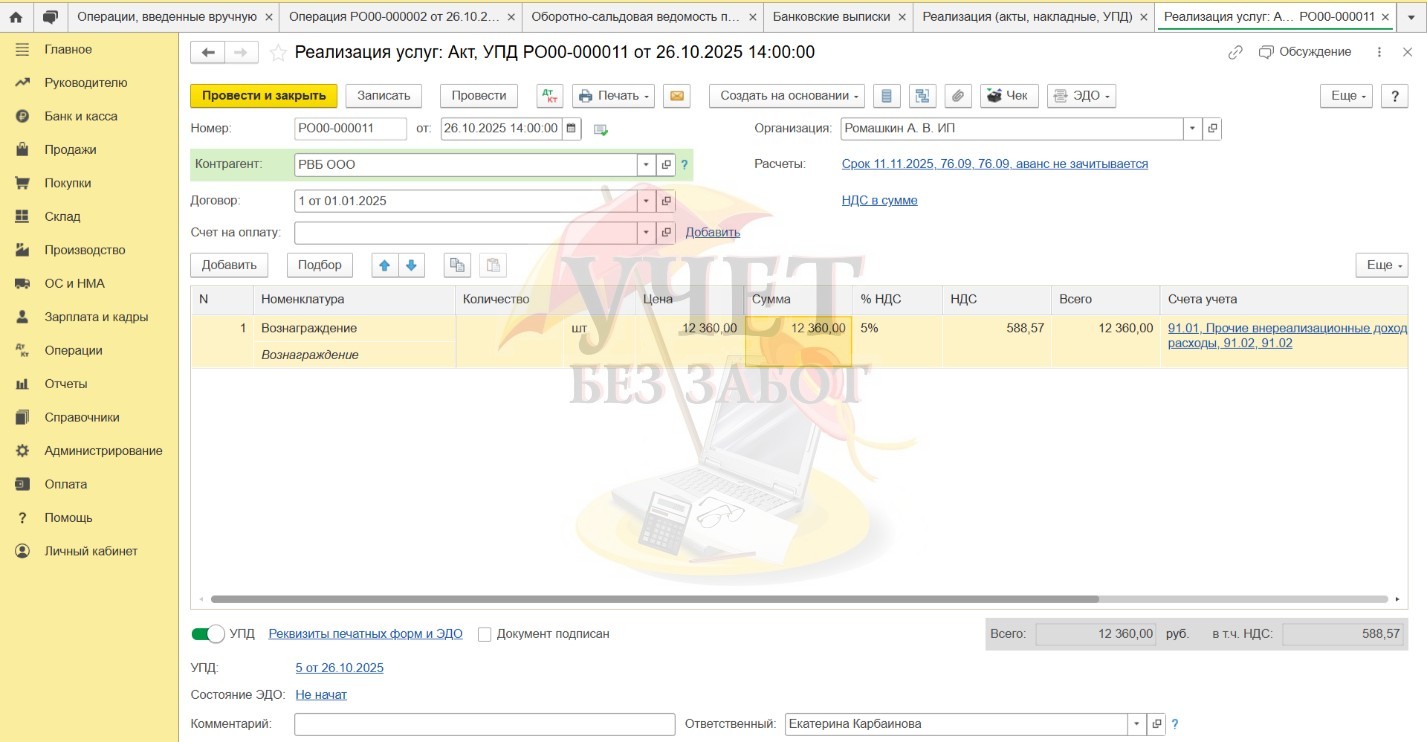 Если вы работаете на УСН, тогда вы можете провести реализацию услуг без НДС. Для этого создаете необходимую номенклатуру и проводите документ с положительной суммой, выбирая отдельный договор с покупателем.