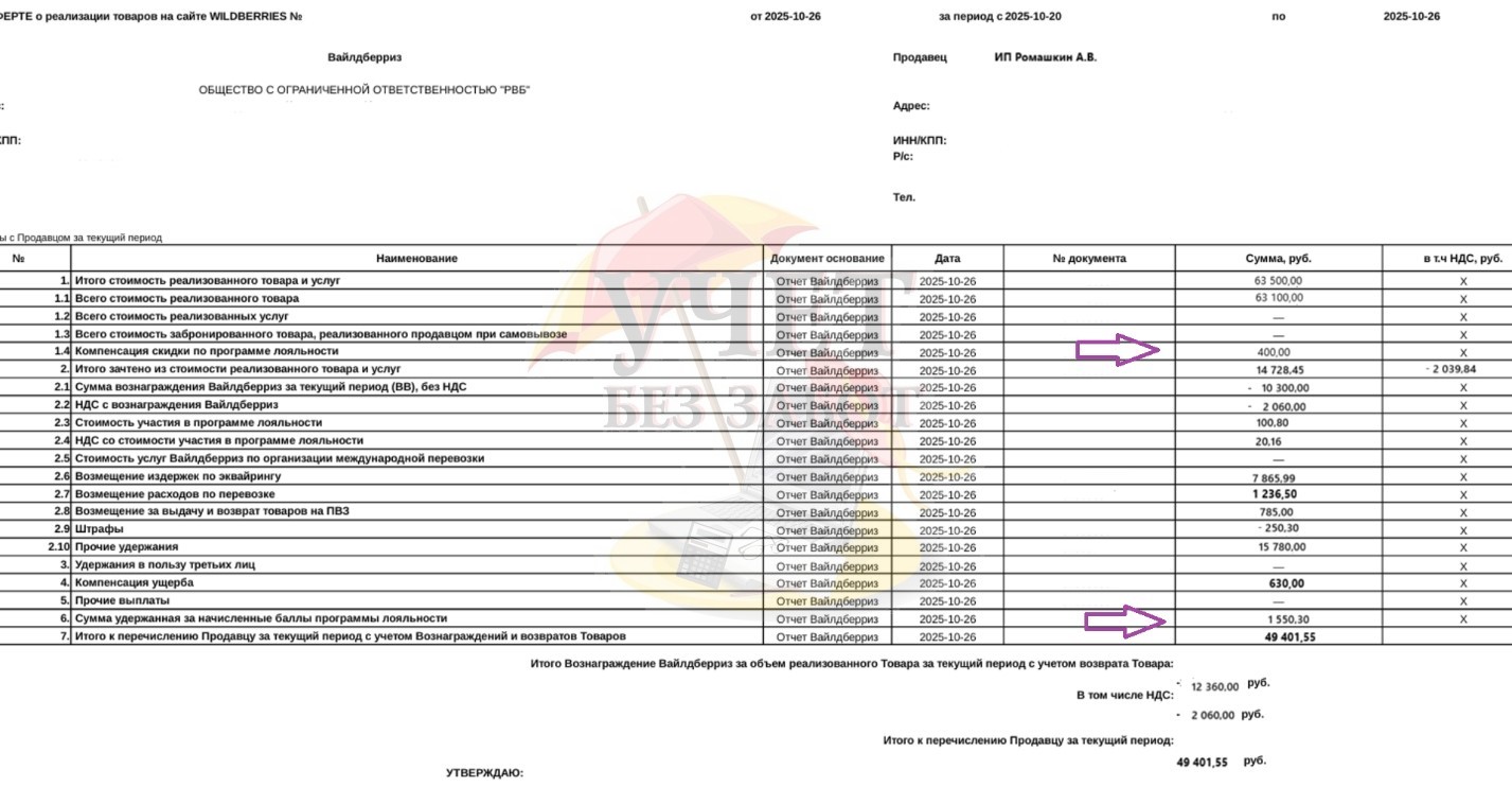 Давайте дальше изучать отчет WB. Среди привычных нам услуг и стоимости реализованного товара здесь есть программа лояльности, которая появилась не так давно – в августе 2025 года.