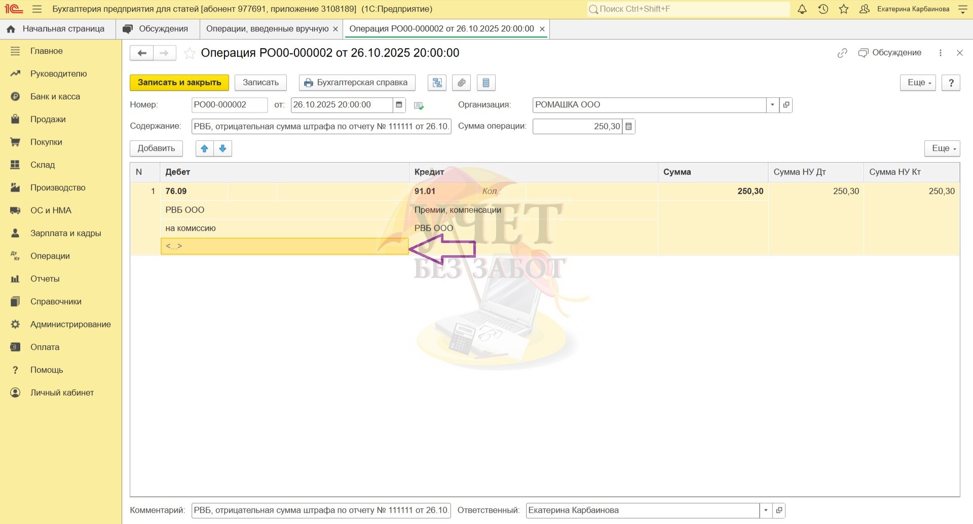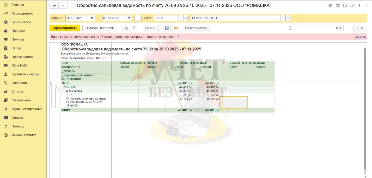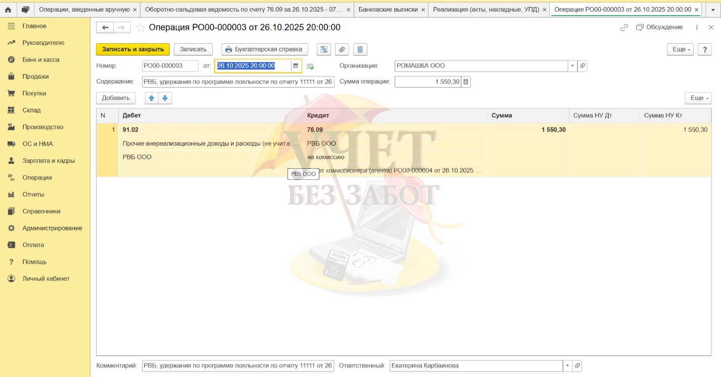 Ручную операцию подвязываем к отчету реализации (выбираем в качестве третьего субконто на счете 76.09), который мы проводим в том же периоде.