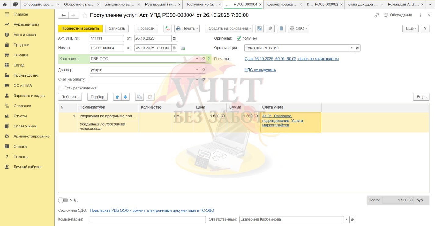 Программу лояльности WB проводит не бесплатно, поэтому стоимость участия в программе лояльности включена в общий УПД на услуги? и эта сумма отражается как обычное поступление услуг.