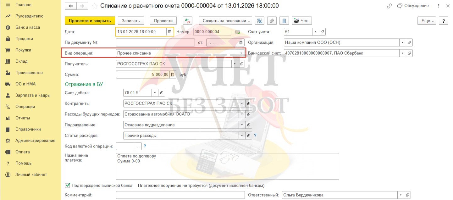В разделе меню «Банк и касса» - «Банковские выписки» создадим новый документ «Списание с расчетного счета». Для корректного отражения оплаты за полис следует выбрать вид операции «Прочее списание».