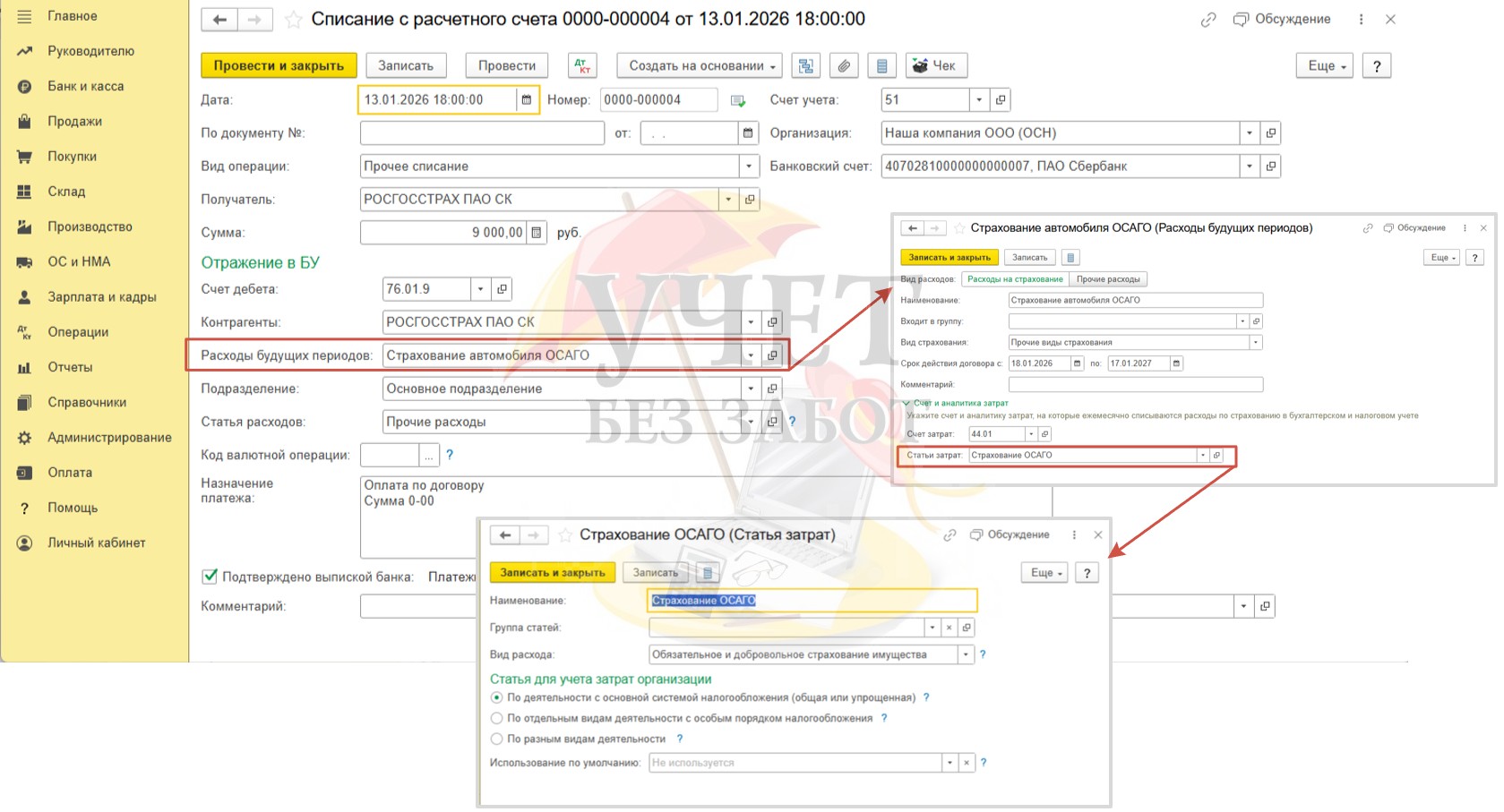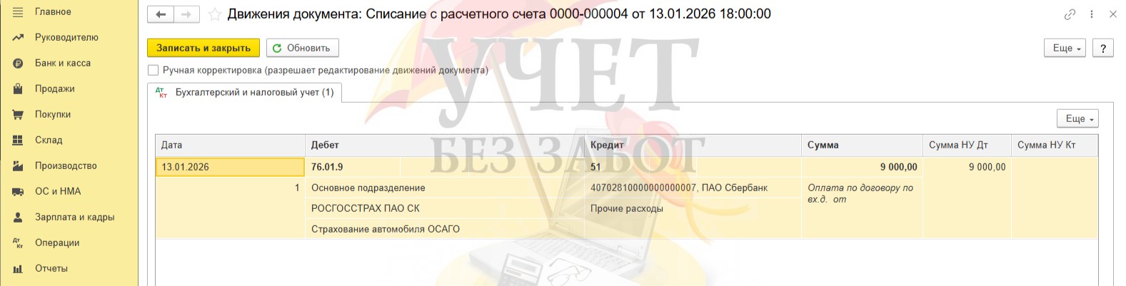 13.01.2026 с расчетного счета организации произведена оплата в пользу ПАО СК Росгосстрах на сумму 9 000 руб. для оплаты по договору ОСАГО. Период действия страхового полиса – с 18.01.26 по 17.01.27.