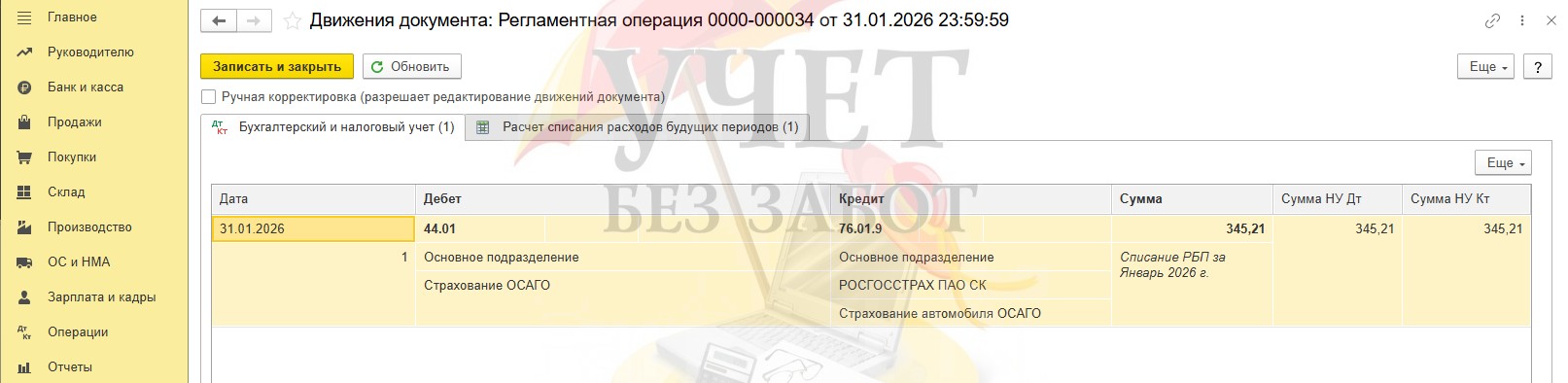 Видим, что на счет затрат отнесена сумма в размере 345 руб. 21 коп. Сумма рассчитана пропорционально дням оплаченного страхового периода. То есть 9 000 / 365 * 14 = 345, 21. (14 дней — это срок действия договора в январе – с момента начала действия договора по последний день месяца – с 18.01.2026 по 31.01.2026).