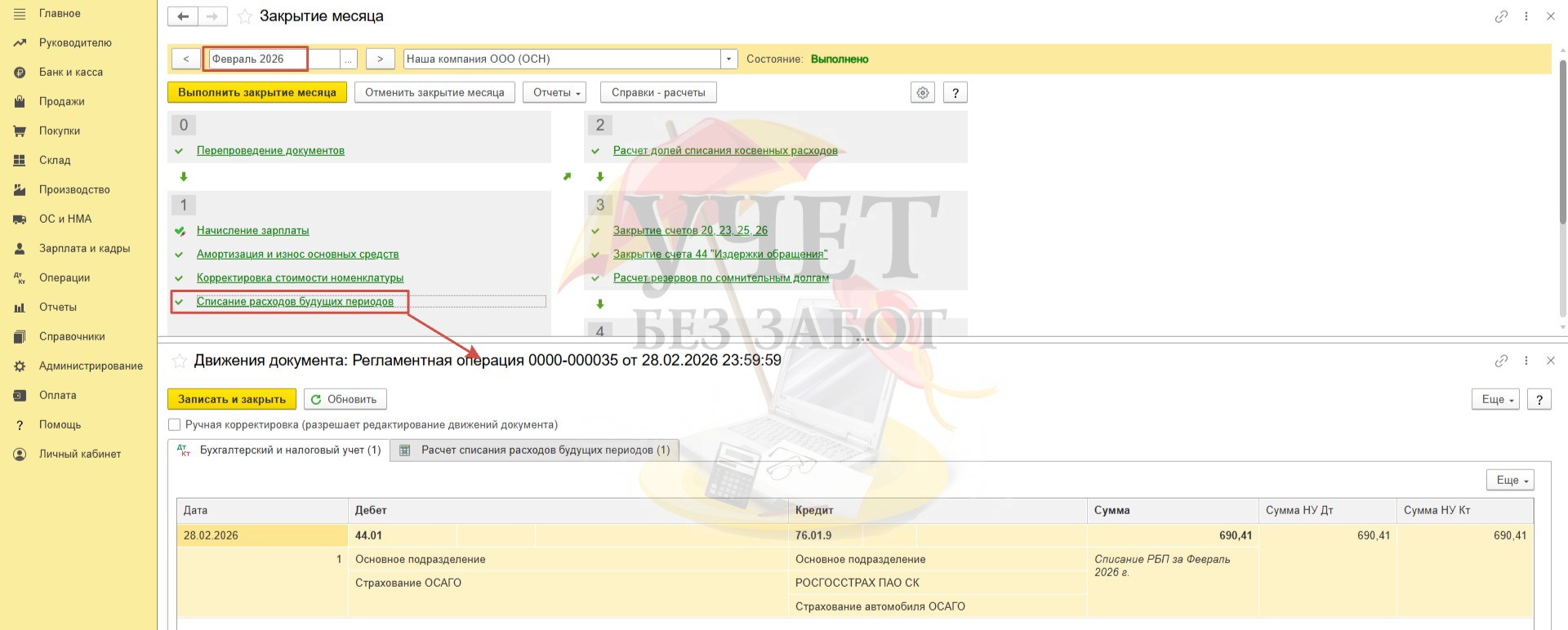 После того как будет завершена процедура закрытия месяца по февраль включительно в разделе меню «Операции» - «Закрытие месяца», обратимся к регламентной операции «Списание расходов будущих периодов» за январь.