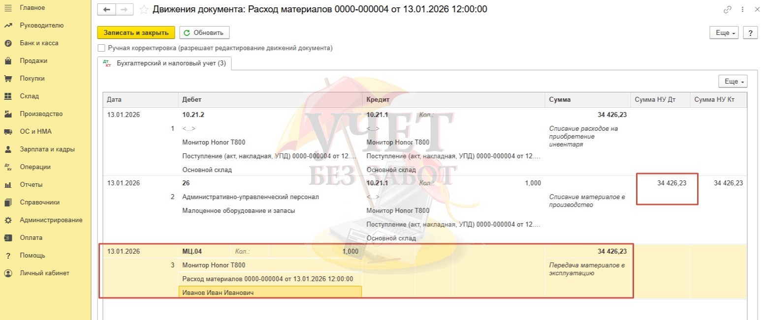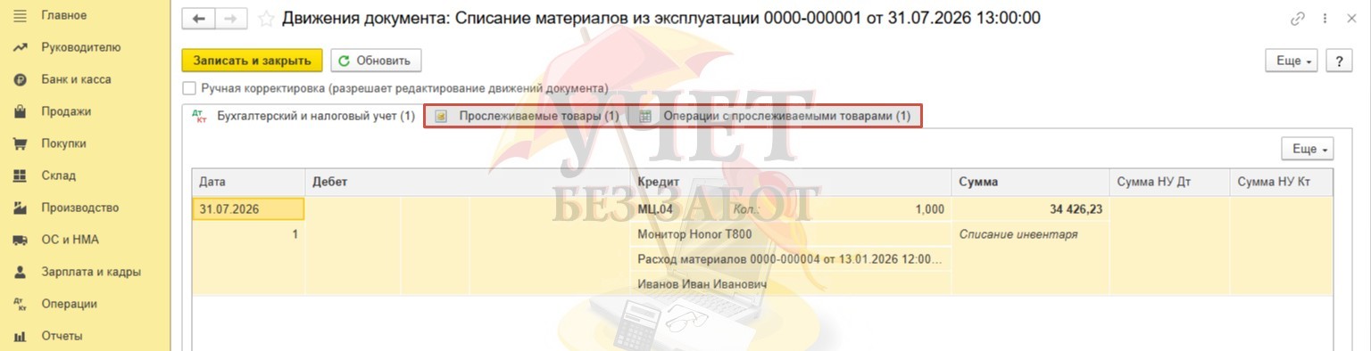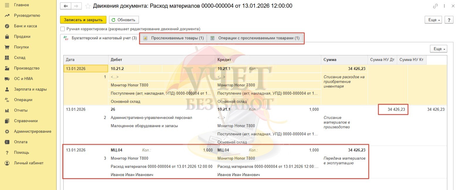 В этом случае в проводках у нас спишется стоимость монитора в налоговом учете, однако на забалансовом счете МЦ.04 монитор не останется. Кроме этого, появятся регистры прослеживаемости.