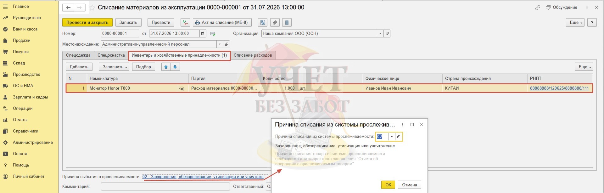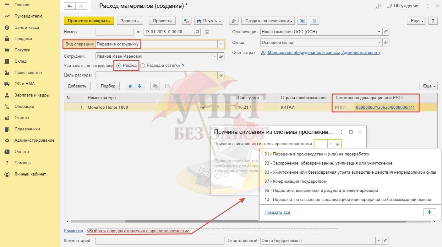Для сравнения приведем другой пример. Если в поле «Учитывать по сотруднику» установлен ползунок для значения «Расход», то программа это расценит как прекращение прослеживаемости. В этом случае она потребует указать необходимый РНПТ, а в подвале документа – подобрать причину списания для составления отчётности.