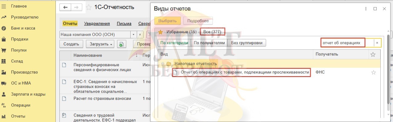 Соответственно такую покупку также нужно будет отразить в отчёте об операциях с прослеживаемыми товарами. Для формирования такого отчёта следует перейти в раздел меню «Отчёты» и выбрать пункт «Регламентированные отчёты». Затем нажать на кнопку «Создать» и в окне «Виды отчётов» на вкладке «Все» при помощи поисковой строки можно найти необходимый отчёт «Отчет об операциях с товарами, подлежащими прослеживаемости».