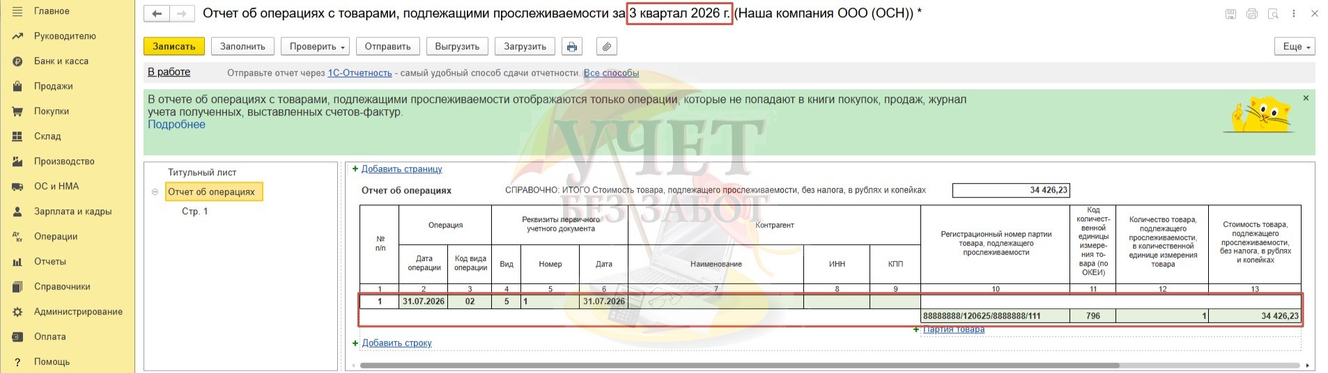 Переходим в раздел меню «Отчеты» - «Регламентированные отчеты». Формируем и заполняем «Отчет об операциях с товарами, подлежащими прослеживаемости» за 3 квартал. Реквизиты прослеживаемого объекта автоматически попадают в отчет с кодом вида операции «02» - «Захоронение, обезвреживание, утилизация или уничтожение».