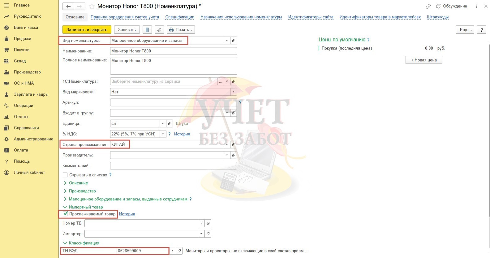 Перейдем в карточку номенклатуры. По условиям нашего примера организация приобретает малоценное оборудование. Соответствующее значение нужно выбрать в поле «Вид номенклатуры». Кроме этого, для корректного отражения прослеживаемых товаров в программе, важно правильно заполнить карточку номенклатуры. После того как мы выберем страну в поле «Страна происхождения», в карточке становится доступным подраздел «Импортный товар». Здесь нужно установить флаг «Прослеживаемый товар». Ниже, в подразделе «Классификация» следует выбрать соответствующий код в поле «ТН ВЭД».