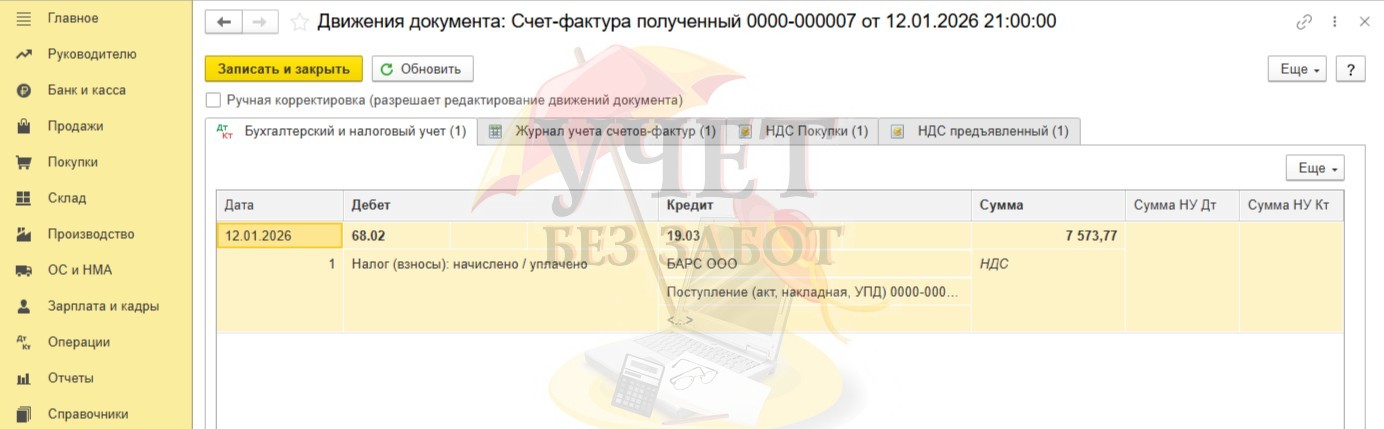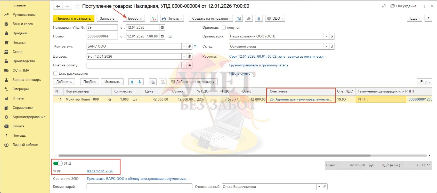 12.01.2026г – организация приобрела монитор (1шт.) на сумму 42 000 руб. (в т.ч. НДС – 7 573 руб. 77 коп.);