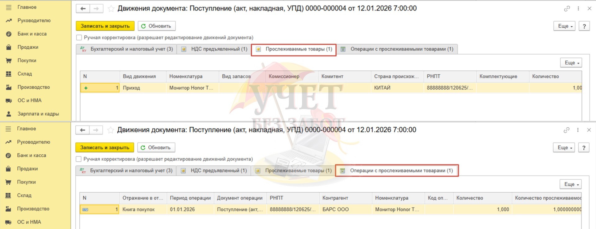 Почему? Потому что если были закуплены какие-либо прослеживаемые товары, а потом какие-то из них было решено использовать как малоценные ТМЦ или ОС, то право собственности на этот товар и РНПТ сохраняются до момента их выбытия. При таких настройках на текущей версии программа даже не выводит поле «РНПТ» в табличную часть.