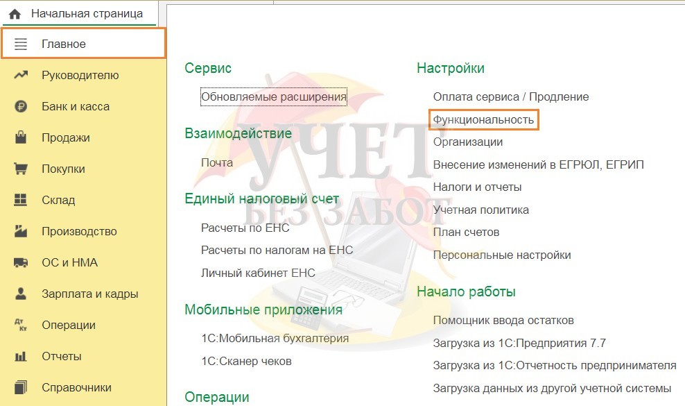 Для отражения операций с комиссионерами в первую очередь необходимо включить данный функционал в программе. Для этого необходимо перейти в раздел меню «Главное» и выбрать пункт «Функциональность».