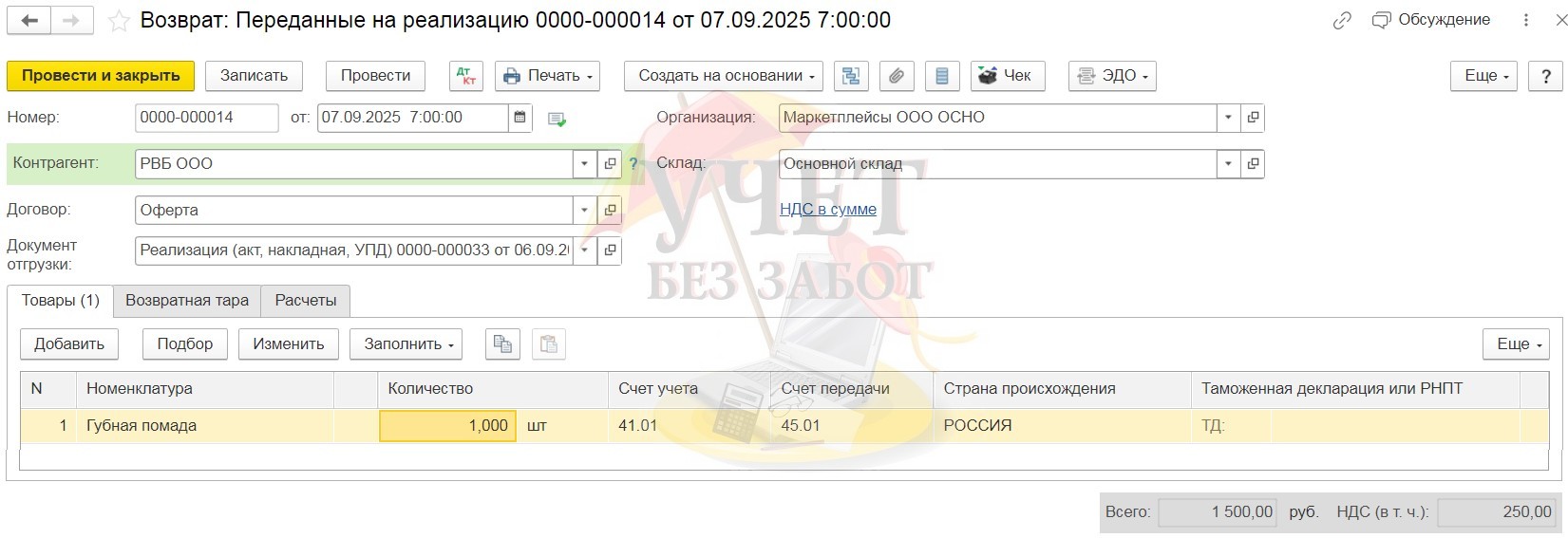 Программа создаст проводку, обратную передаче товаров маркетплейсу. В нашем примере это: Дт 41.01 Кт 45.01.