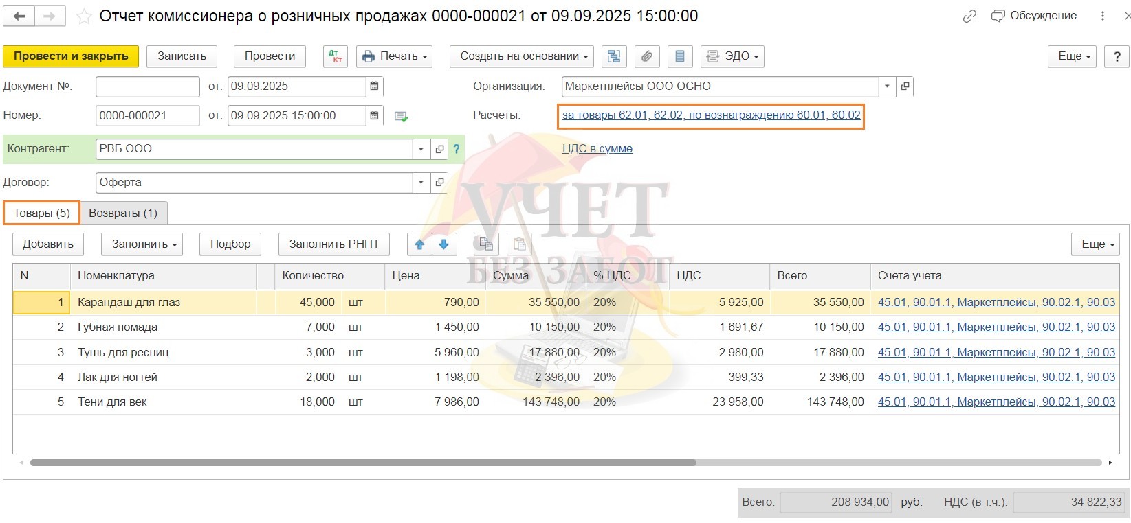 Если возврат невостребованных товаров был отражён маркетплейсом в документах продажи, то их необходимо добавить на вкладку «Возвраты» вручную или загрузить. При заполнении возвратов обязательно проверьте заполнение поля «Документ реализации». После проведения документ создаст проводки: