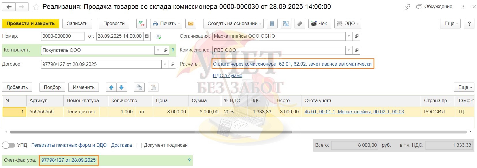 В графе «Контрагент» следует выбрать реального покупателя, а в графе «Комиссионер» - маркетплейс. Обязательно проверьте, чтобы в графе «Расчёты» было установлено, что оплата от покупателя придёт через комиссионера. Это позволит не вводить дополнительный документ «Корректировка долга». Так же, торговые площадки выставляют за нас счета-фактуры нашим покупателям юридическим лицам и дублируют нам сведения о них. Поэтому, после регистрации счёт-фактуры на продажу, нам нужно заменить номер на тот, что был присвоен маркетплейсом.