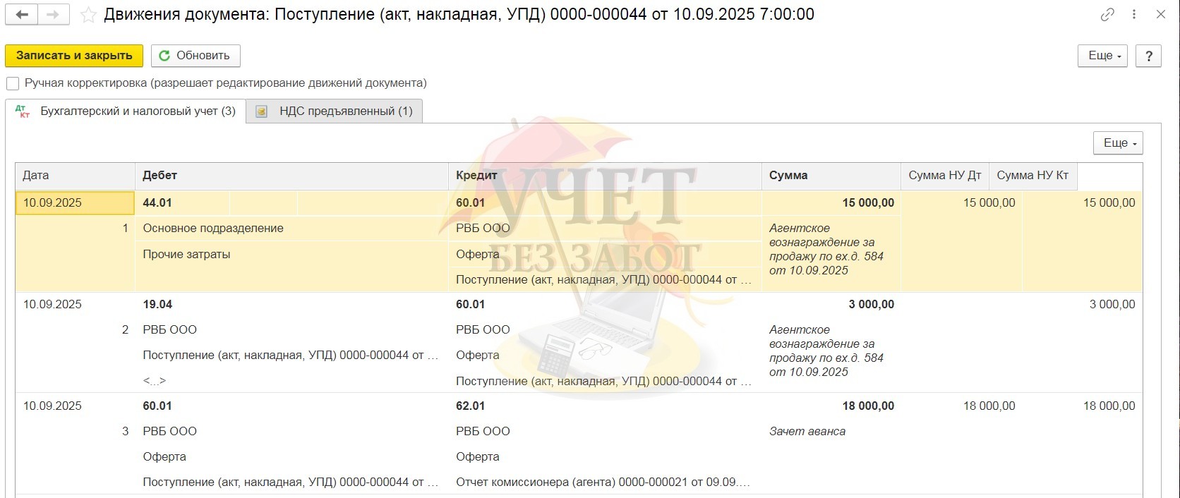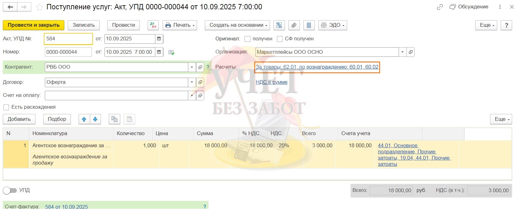 Проведённый документ создаст проводку Дт 44.01 Кт 60.01 на сумму услуг без НДС и Дт 19.04 Кт 60.01 на сумму НДС.