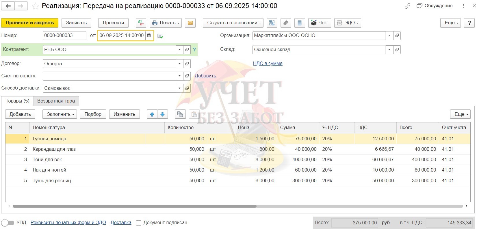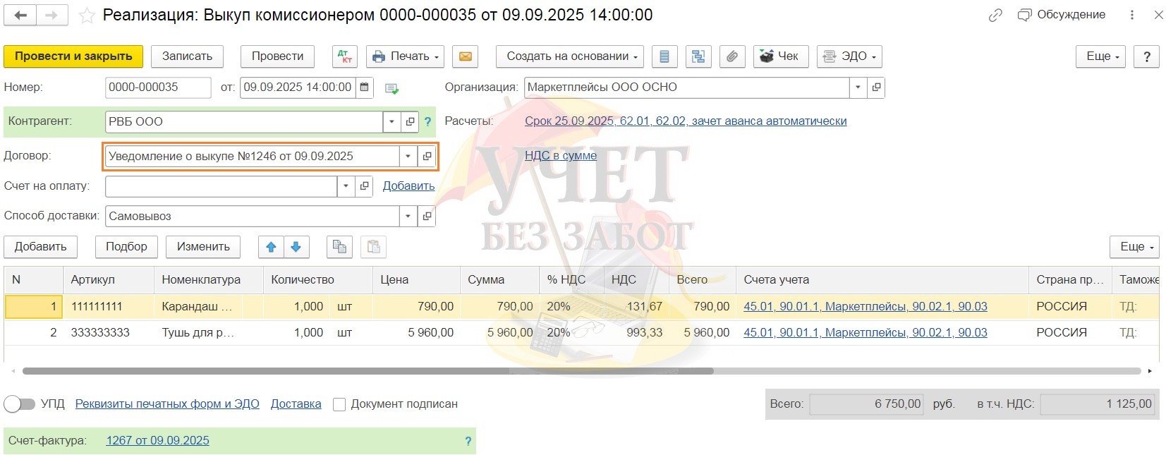Фактически, выкуп комиссионером – это прямая сделка, в которой мы являемся продавцом, а маркетплейс является покупателем. Поэтому проводки в документе будут, как при стандартной продаже. Только вместо счёта 41 или 43, будет использован 45 счёт. Так же, обращаю ваше внимание на поле «Договор». Здесь нужно выбирать договор с видом «С покупателем». Это может быть либо один договор с названием «Выкупы», либо можно под каждый выкуп создавать отдельный договор с номером и датой выкупа.