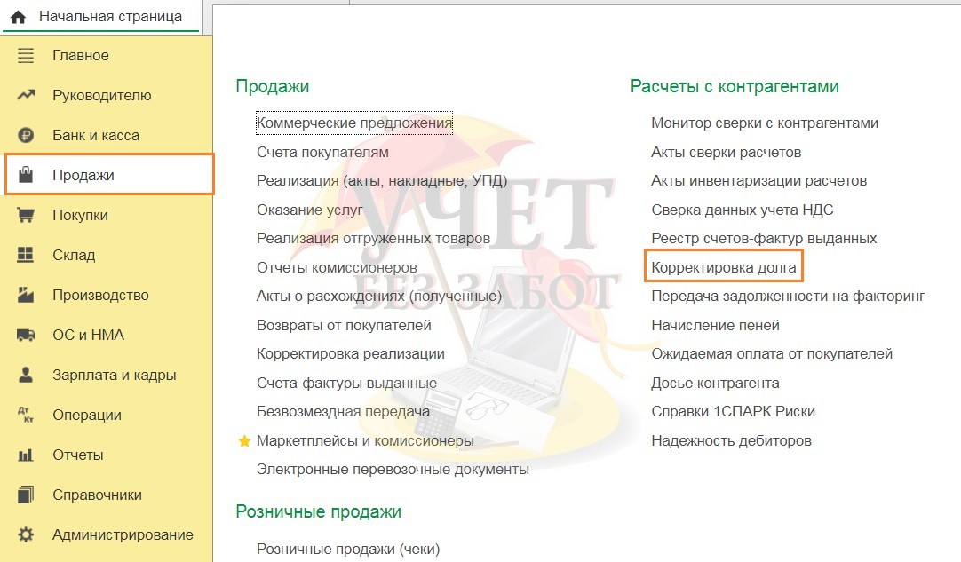 В некоторых случаях, для зачёта сумм встречных однородных требований, нам требуется в программе вводить такой документ, как «Корректировка долга». Он расположен в двух разделах меню: «Покупки» или «Продажи».