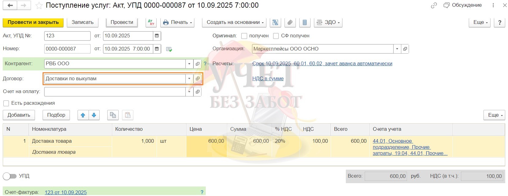 Например, нам пришёл УПД на международную доставку по выкупу. Введём документ «Поступление услуг (акт, УПД)»: