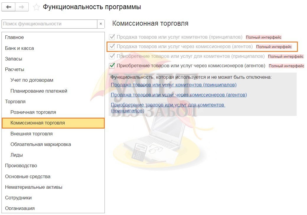 В открывшемся окне следует перейти на вкладку «Комиссионная торговля» и установить флаг «Продажа товаров или услуг через комиссионеров (агентов)».