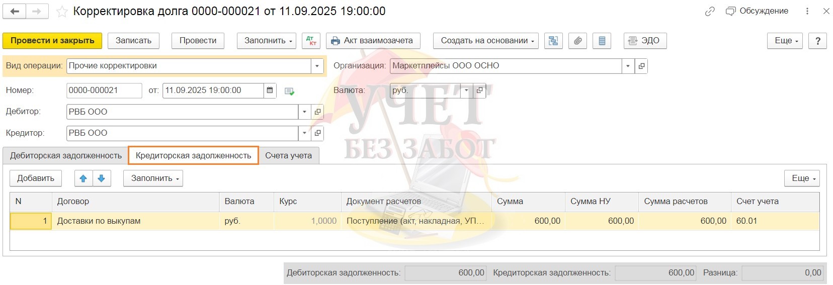 Проведённый документ создаст проводку Дт 60.01 Кт 62.01 (76.09). Таким образом, сальдо на счёте 60.01 будет закрыто: