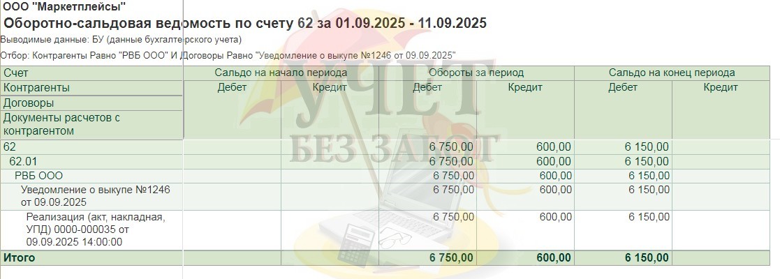 Таким образом, у нас есть дебетовое сальдо по выкупу на счёте 62.01 (76.09) и кредитовое сальдо по международной доставке на счёте 60.01.