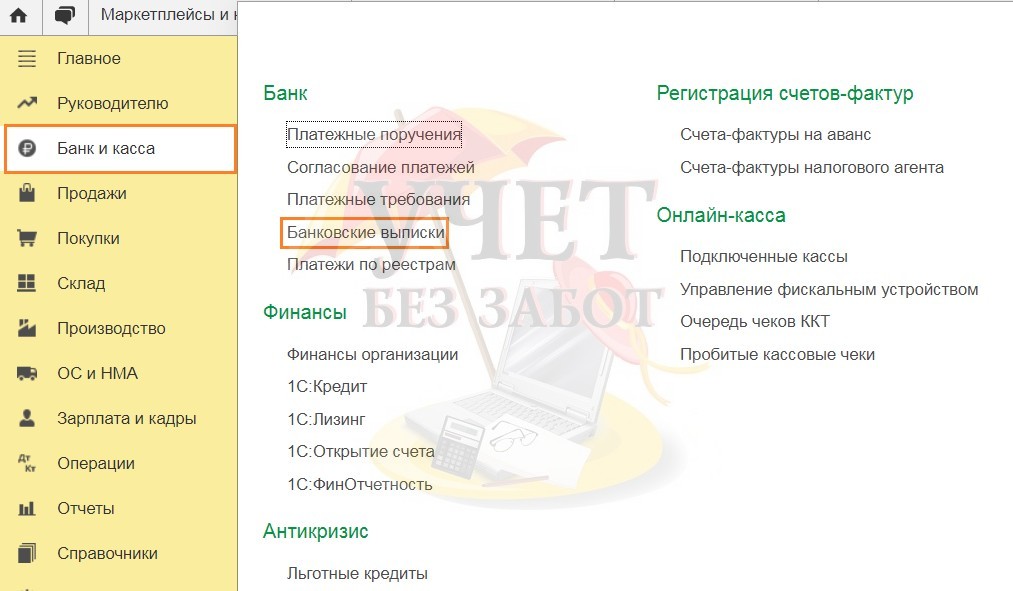 Для отражения денежных средств, поступивших от торговой площадки, необходимо перейти в раздел меню «Банк и касса» и выбрать пункт «Банковские выписки».