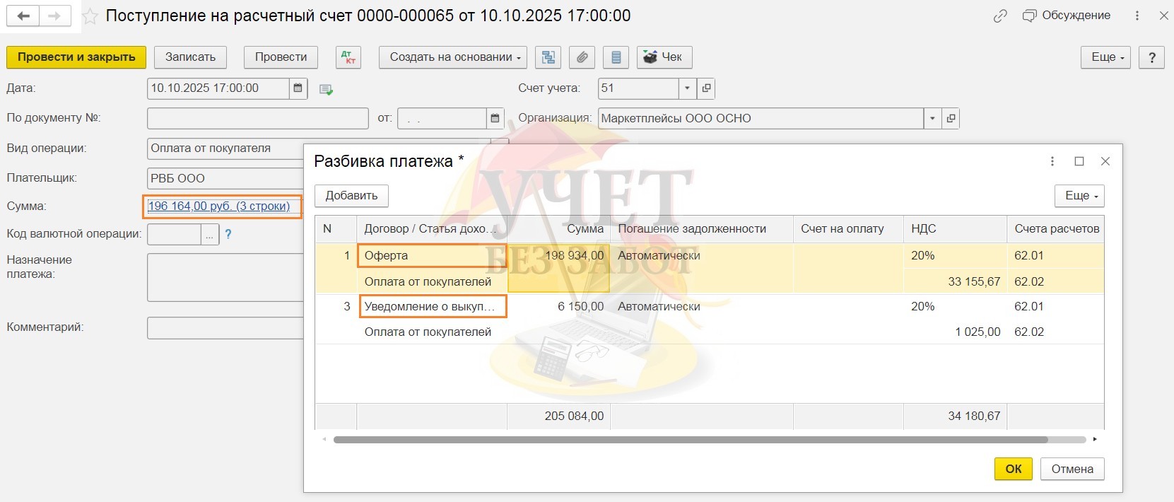OZON обычно перечисляет денежные средства по выкупам и по продажам – отдельными платёжными поручениями, а WB суммирует все задолженности и делает единой перечисление. Поэтому иногда приходится делать разбивку суммы платёжного поручения вручную. В результате взаиморасчёты по счёту 62 (76.09) будут закрыты.