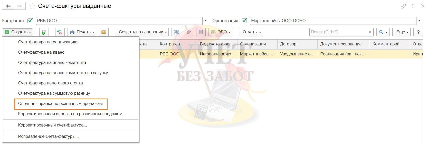 Но при этом у нас всё равно есть обязанность формирования книги продаж на основании первичных документов. В программе 1С: Бухгалтерия предприятия приходит на помощь документ «Сводная справка по розничным продажам», который вводится в разделе меню «Продажи» - «Счета-фактуры выданные».
