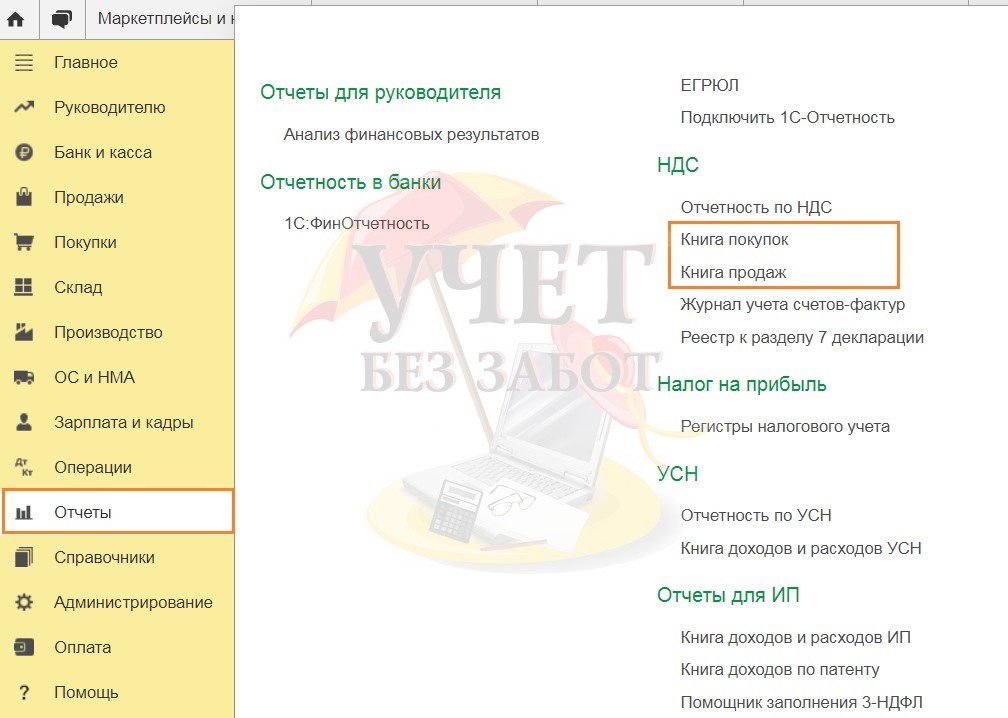 Перейдём в раздел меню «Отчёты» и сформируем поочерёдно книгу покупок и книгу продаж.