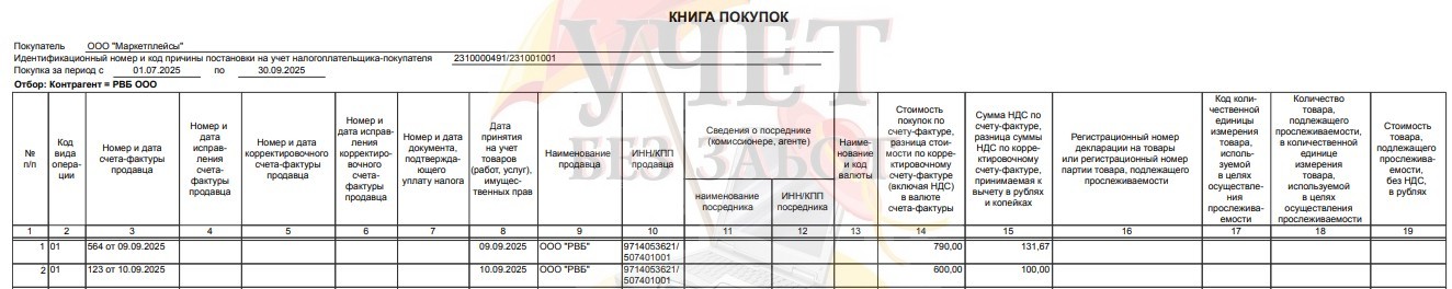 В книге покупок будет отражено вознаграждение маркетплейса и УПД за дополнительные услуги, отражённые на счёте 60.