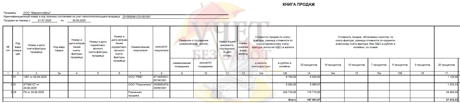 В книге продаж будут отражены продажи юридическим лицам, розничные продажи через комиссионера и выкупы товара маркетплейсом.
