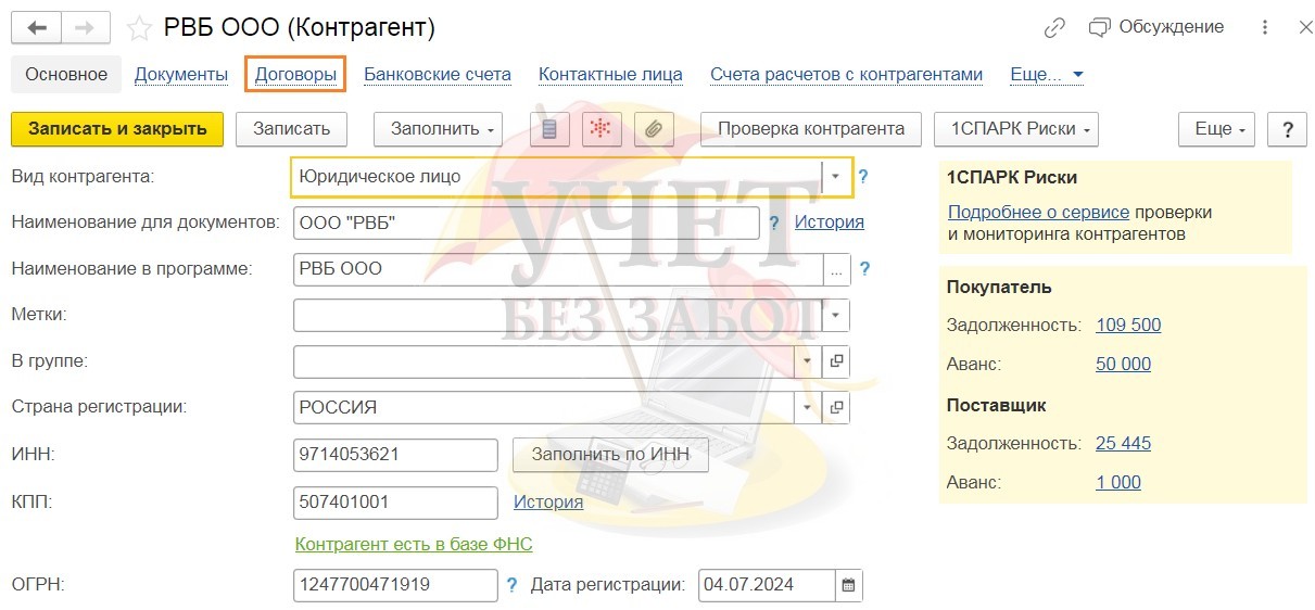 После ввода договоров, контрагента можно сохранять и закрывать справочник.