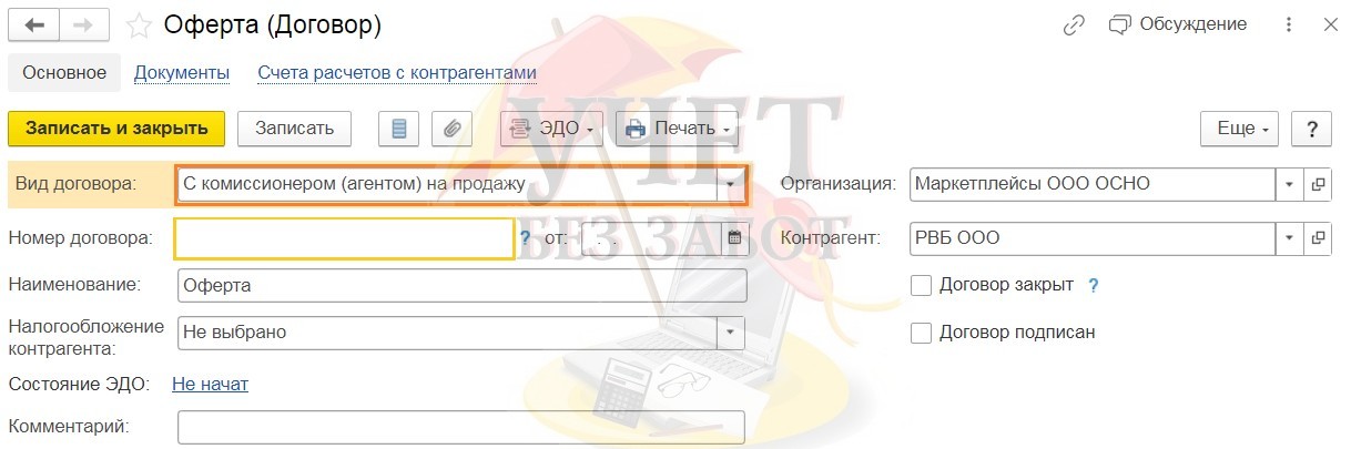 Введём договор с видом: «С комиссионером (агентом) на продажу». Это будет основной договор, который можно назвать «Оферта».