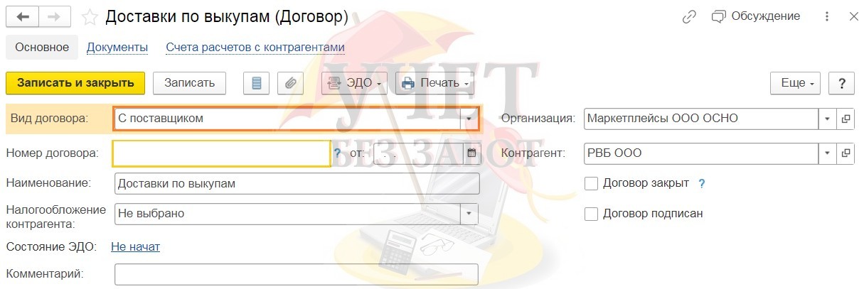 Третий вид договора «С покупателем» мы будем использовать для проведения выкупов товара, при его продаже в страны ЕАЭС. Заранее такой договор лучше не создавать, так как у каждого выкупа имеется свой номер Уведомления о выкупе, который мы и будем указывать в наименовании.
