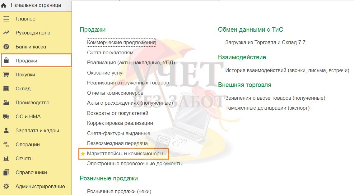 Перейдём в раздел меню «Продажи» и выберем пункт «Маркетплейсы и комиссионеры».