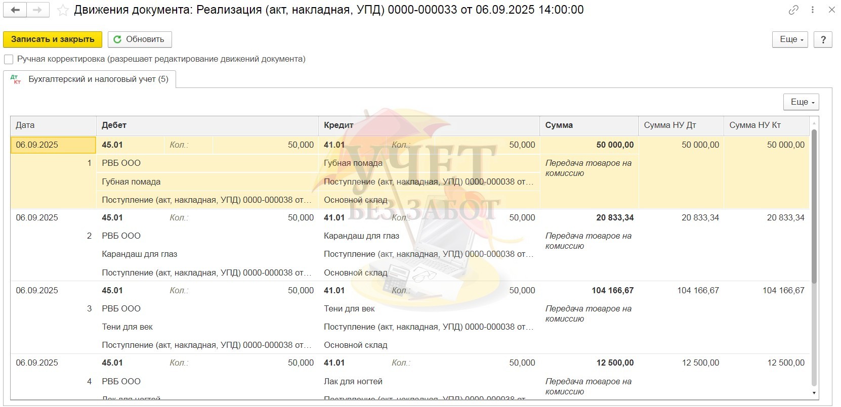 Проведённый документ создаст проводки: