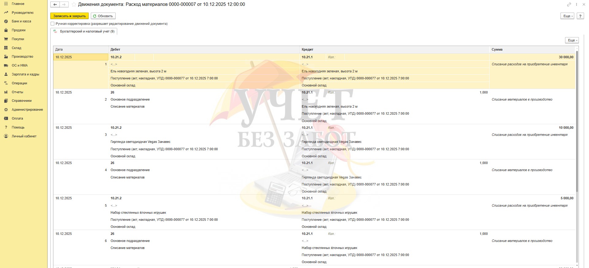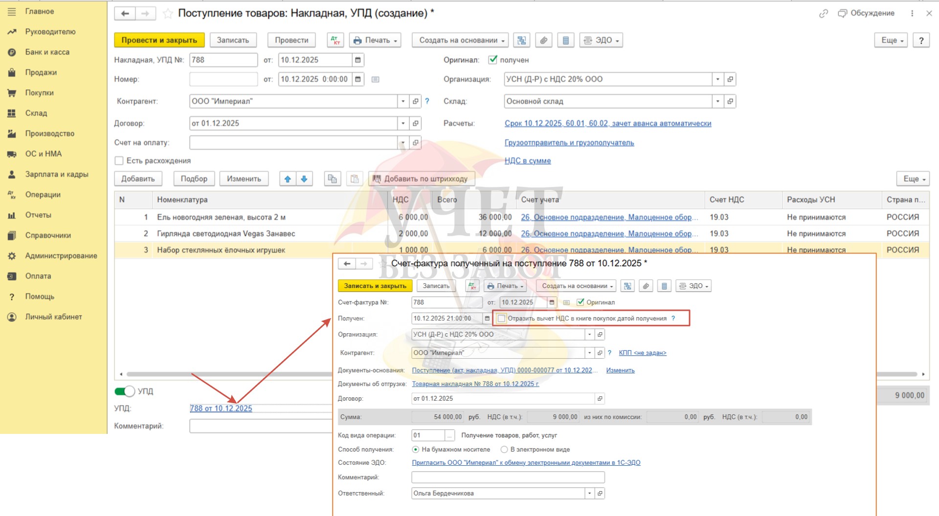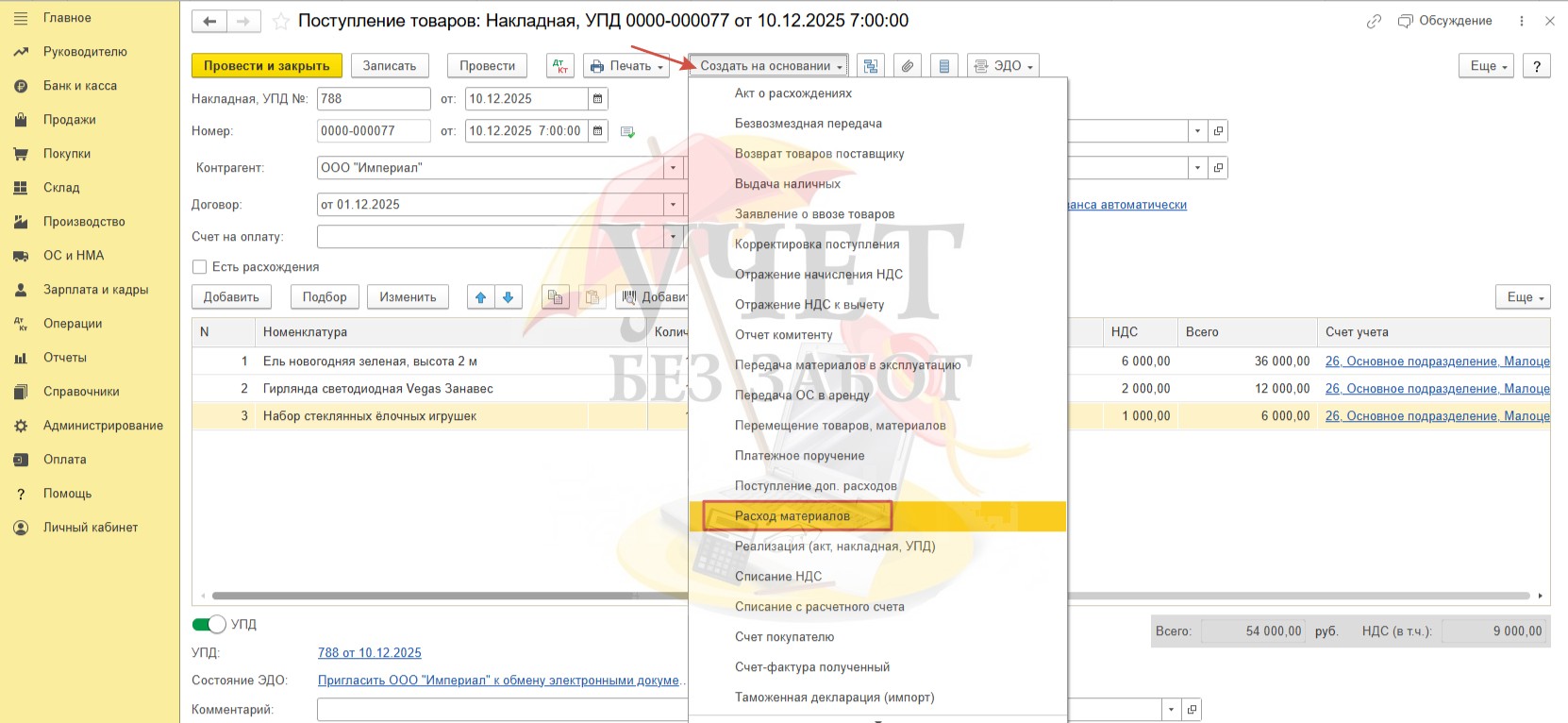 10.12.2025 – приобретена искусственная ель, электрогирлянды и шары на сумму 54 000 руб. (в т.ч. НДС – 9 000 руб.), это будем принимать как малоценное оборудование;