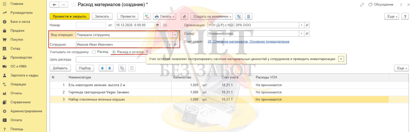 В документе необходимо выбрать вид «Передача сотруднику», а для поля «Учитывать по сотруднику» можно выбрать вариант «Расход и остатки». Такая настройка позволит дополнительно проконтролировать остатки ТМЦ в разрезе сотрудников.