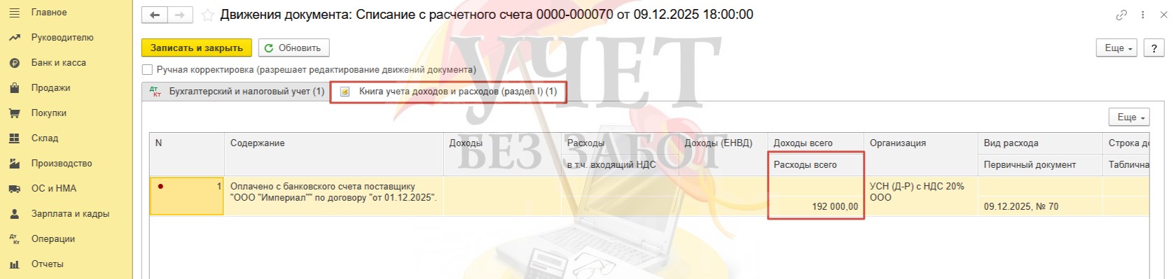 По налоговому учету сформирована запись в регистр «Книга учета доходов и расходов (раздел I)», но сумма проходит только по колонке «Расходы всего». Это значит, что она не учитывается при расчете налога УСН.