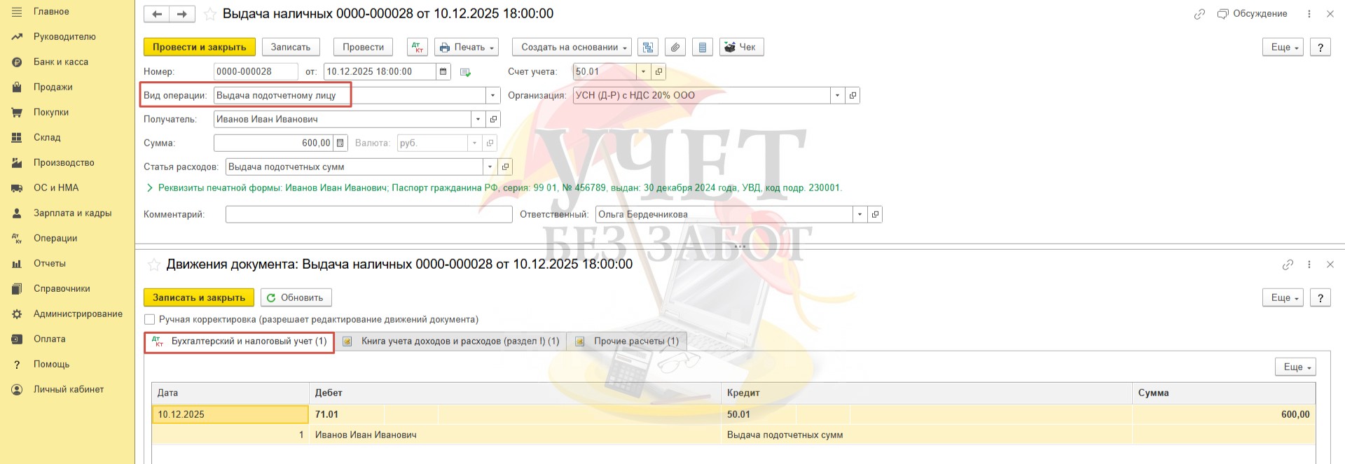 В разделе меню «Банк и касса» - «Кассовые документы» зарегистрирован документ «Выдача наличных» с видом операции «Выдача подотчетному лицу». При проведении документа по бухгалтерскому учету сформирована проводка Дт 71.01 Кт 50.01.