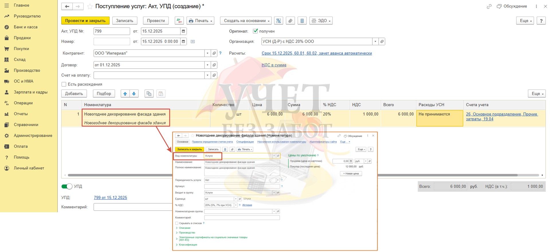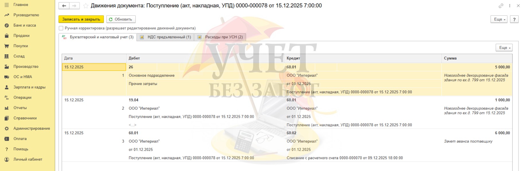 15.12.2025 – оказаны услуги по оформлению фасада здания на сумму 6 000 руб. (в т. ч. НДС - 1 000 руб.).