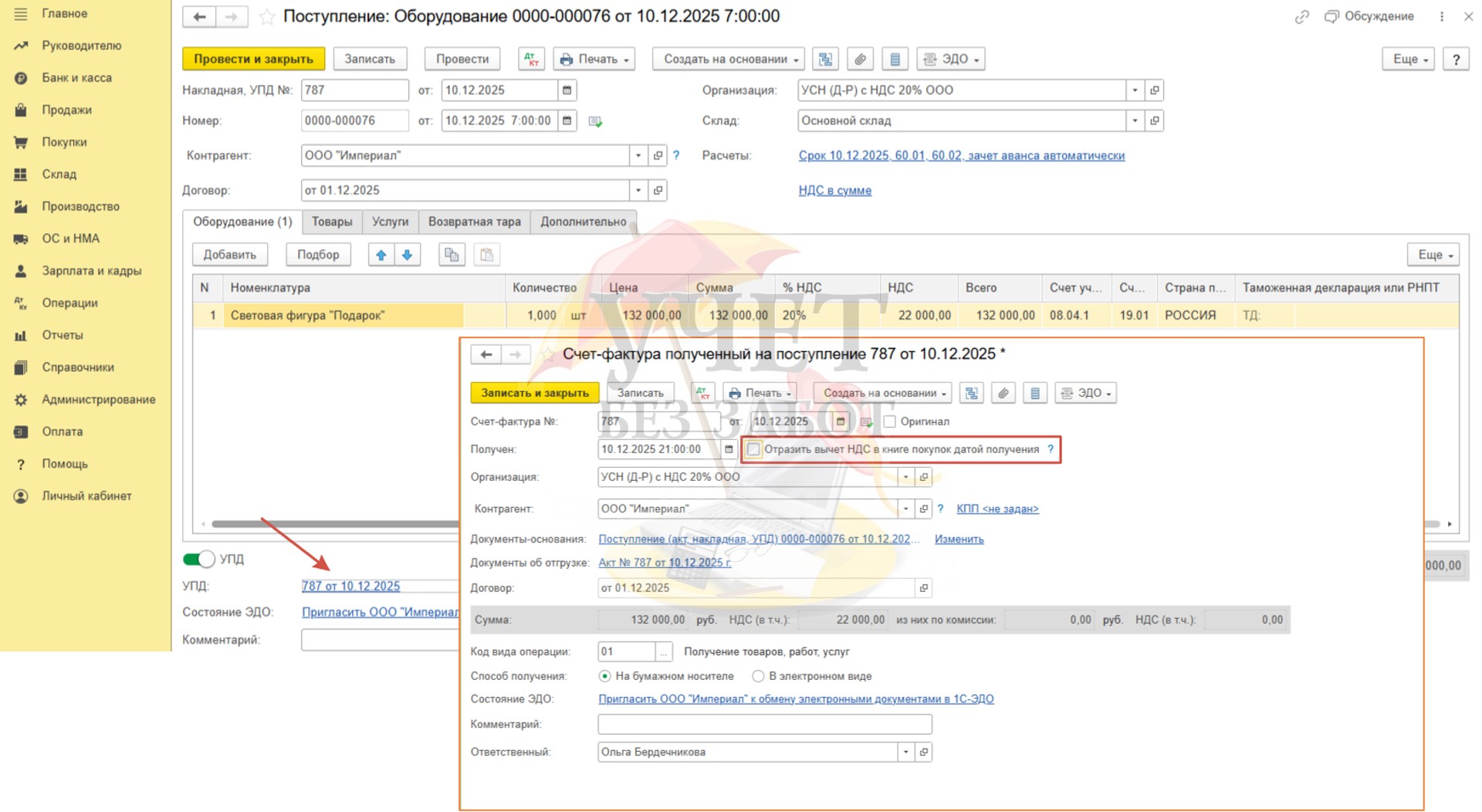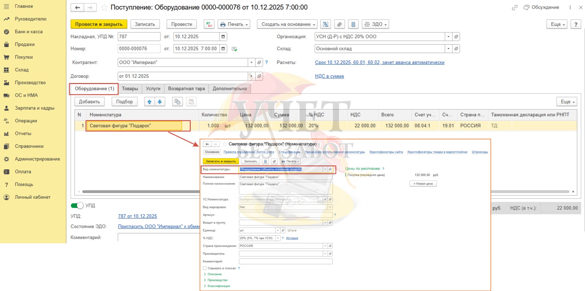 10.12.2025 – приобретена световая фигура на сумму 132 000 руб. (в. т.ч. НДС – 22 000 руб.), это будет основное средство;