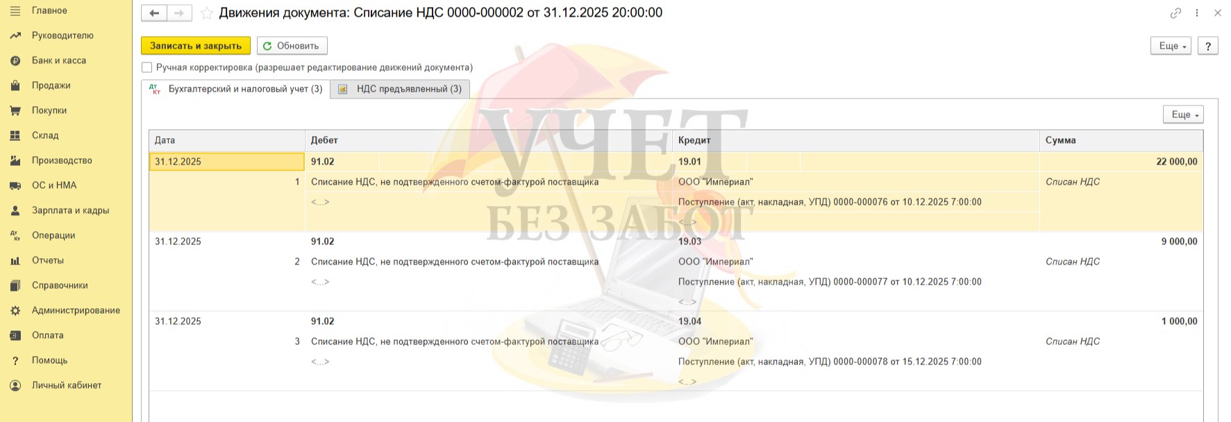 После проведения документа стоимость украшений отнесена на расходы только по бухгалтерскому учету. В налоговом учете расходы не учтены. Кроме этого, сформирована проводка по зачету аванса поставщику, а также сумма «входного» НДС выделена на счет 19. Напомним, что он подлежит списанию (Шаг 6).